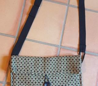 Sac bandoulière à pois vert/noir/crème, intérieur noir + 1 poche. Bandoulière noire réglable. Rabat fermé par un bouton. Hauteur = 30 cm Larg = 32 cm