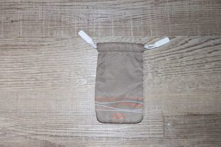 Pochette kaki pour crème solaire de la marque AVENE Liserés blancs et orange Ecriture orange "Eau thermale AVENE" Liens de resserrage blancs pour fermer la pochette Dimensio