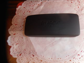 Boitier à lunettes, de la marque originale STARCK Eyes (logo ton sur ton sur le dessus), de couleur noire, intérieur entièrement tapissé de feutrine velours orange. Dimensions