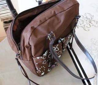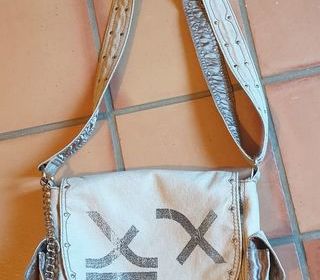 Sac beige en toile avec surpiqûres noires de marque Mexx. Nombreuses poches, 2 sur les côtés, + 3 à l'intérieur. Bandoulière réglable. Un peu usé sur le devant et à l'arrière (voi