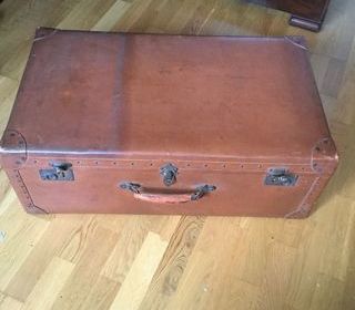 Valise ancienne en carton bouillie et tissu dans son jus. Elle date du début du vingtième siècle :1900 à 1930. Elle possède un compartiment indépendant, avec lanières de fixa
