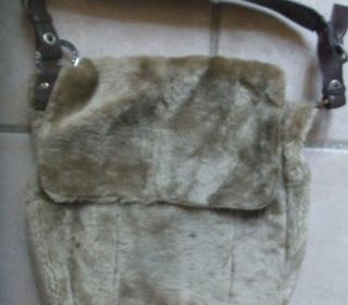 Sac Mango en fausse fourrure, grand rabat, intérieur non doublé, bandoulière synthétique réglable pour porter main, bras ou épaule, dimensions sac fermé : 28 x 27 x 8 cm.