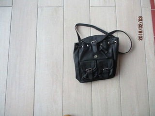 Sac à dos, en cuir noir, à l'intérieur une poche avec fermeture éclair, à l'extérieur 2 poches avec pressions, lien pour serrer le sac, rabat avec pression, poignée pour le porter