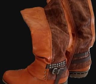 Très belles bottes mi imitation cuir mi textile. Marron/caramel . Très solides.