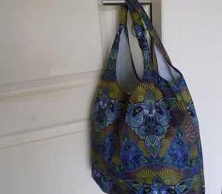 Joli sac pliable avec son sac de rangement, orné de motifs multicolores, fermé par une lanière à pression, 2 grandes anses pour le porter soit à la main, soit sur l'épaule, matière