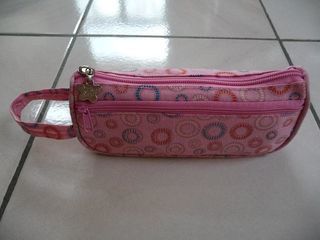 Trousse rose motifs bleus, blancs et oranges, entièrement doublée, lavable machine à 30 °, fermée par glissière, 1 grande poche supplémentaire devant fermée par glissière, poignée