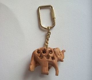 Porte clés éléphant sculpté en bois naturel. Anneau à maillon rapide et chaînette dorés. N'a jamais été utilisé. Hauteur totale avec l'anneau : 9 cm Longueur de l'éléphant : 5 cm