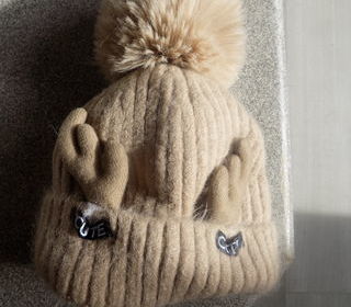 Très beau bonnet pour adulte marron clair avec pompon et 2 petites cornes de rennes très chaud, de très bonne qualité et très peu porté