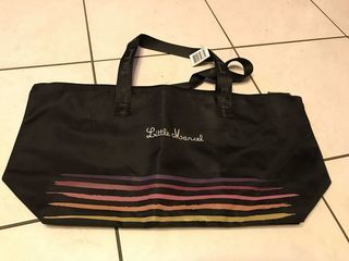 sac little marcel NOIR AVEC BASE EN RAYURES MULTICOLORES Sac de courses ou voyage intérieur doublure de la marque fermé par fermeture éclair largeur : 53.5 cm hauteur 28 cm