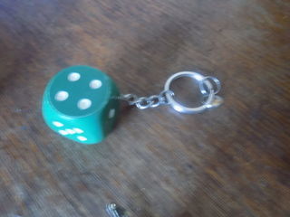 lot de 4 beaux porte-clés comprenant un avec un dé avec une face miroir (6) en très bon état, un avec un trèfle à quatre feuilles et une balle avec le chiffre 13, un avec un rectan