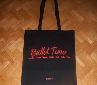 Sac en belle toile noire, avec inscriptions rouge vif " Bullet Time " sur le recto, de la marque originale " Chêne ", verso uni, en 100 % coton, Dimensions : hauteur 41 cm, ha
