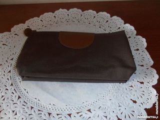 Pochette de couleur marron, décoration demi-cercle marron vernis cousue sur le devant, style "couture", à fermeture éclair agrémentée d'un rond marron vernis pour permettre d