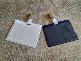 Lot de 2 porte-badge, l'un blanc et l'autre bleu marine, pochette transparente sur le devant pour mettre un badge ou une étiquette nominative, attache par petite pince argentée,