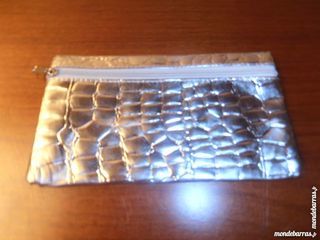Trousse argentée, entièrement doublée de tissu nylon gris, fermeture par fermeture éclair grise, poids : 45 g, dimensions : 18 cm x 13,5 cm x 3 cm. Excellent état car jamais