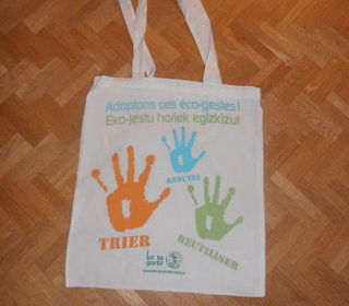 Sac en tissu beige, écrit en français et en basque sur les éco-gestes, dimensions : 38 cm x 42 cm (74 cm avec les anses). Permet de ranger, transporter, protéger, etc... Ex