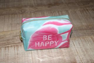 Trousse de toilette en vinyle rigide plastifiée, doublée de tissu nylon vert assorti Trousse aux couelurs acidulés délivrant un message de bonheur "BE HAPPY" pour mettre de bonne