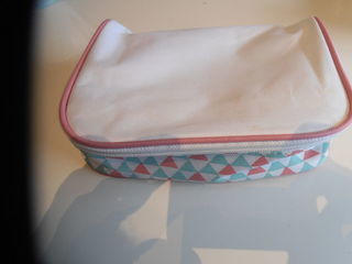 Trousse de toilette à compartiments, de couleur blanche à motifs vert et corail, 1 poche zippée à l'intérieur, 1 séparateur avec élastique permettant d'attacher 6 objets, dim