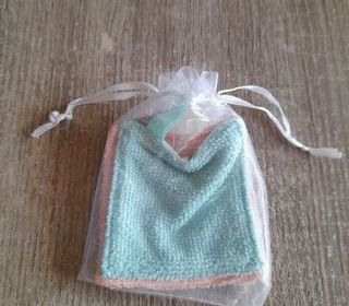 Petite pochette blanche en tulle, comprenant 2 cotons réutilisables, 1 face éponge orange ou verte, 1 face en tissu motifs géométriques, ruan satin sur chaque coton pour suspen