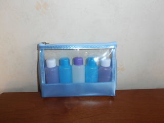 Pochette bleue nacrée et transparente de la marque originale Vichy, très solide, lavable, fermeture par fermeture éclair argentée, avec 5 flacons de voyage, opaques afin de mie