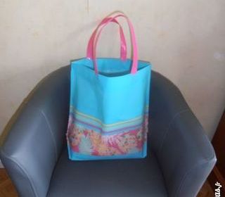 Très grand sac plastifié, très solide et pratique, de couleur bleu azur avec motifs ananas, anses fuchsia assorties, dimensions : - hauteur : 40 cm, - hauteur avec les