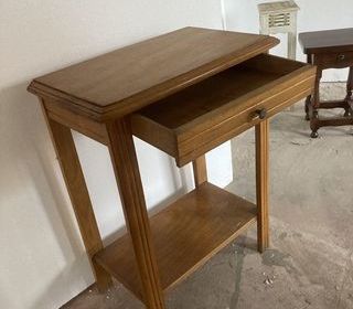 Console d epoque 1970 en hetre deux plateaux et tiroir centré . decor colonne pieds lateraux en façade .79€ petite table d appoint en bois coloré(10€) et petite console bois pe