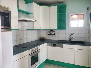Cuisine équipée, longueur : 270 cm, retour (en angle) : 205 cm comprenant : -1 colonne 60 cm avec frigo incorporé (88x55) compris, 1 tiroir en bas, 2 tiroirs au dessus du micro on