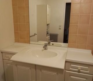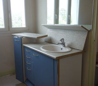 A vendre BON ETAT meuble SDB bois écru avec lavabo et robinet avec 2 meubles de rangement avec étagères et tiroirs de chaque côté plus une colonne de rangement avec étagères et tir