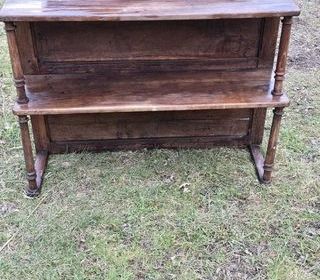 Étagères coloniale en chêne, comportant deux niveaux de rangement ouverts et un petit espace de rangement sur le dessus a 76 cm du sol. telephone et bibelots divers. montre des