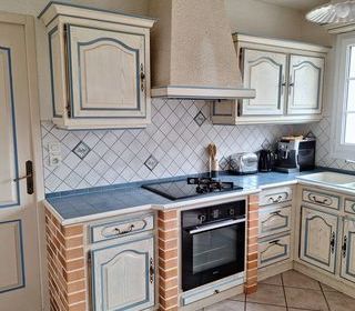 Vends très belle cuisine aménagée et équipée. En chêne massif, blanc cérusé avec liserés bleus réalisée par un ébéniste. Comprenant de nombreux rangements : - 5 placards hauts