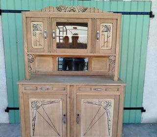 Vend buffet ancien en bois massif, entièrement poncé. Très joli modèle de style Art déco avec motifs gravés d'origine, qui lui donnent beaucoup de charme et d'authenticité. Meubl