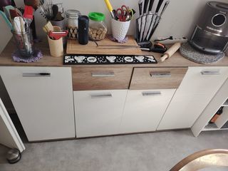 Ensemble de meubles de cuisine en chêne clair avec table plan de travail, composé de 2 meubles hauts avec un angle étagère et 2 meubles bas qui servent de support à la table plan d