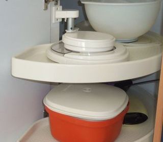 Kit d'étagères rotatives pour meuble d'angle de cuisine, tourniquet demi-lune de Ø69cm blanc, rayon 40cm, en excellent état Le système se compose de 2 plateaux de Ø69cm et d'une b