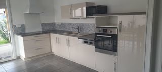 Prix négociable dans la limite du raisonable. Cuisine laquée crème achetée en 2020 avec son plan de travail gris chêne comprenant : 1 tiroir range des couverts coulissant gris