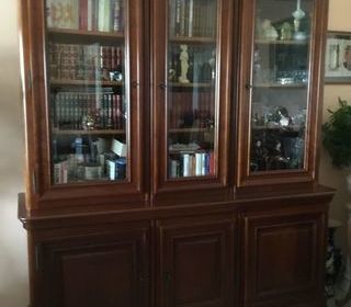 Séjour Bibliothèque table ronde et enfilade Louis Philippe en merisier massif, fabrication française en très bon état. Bibliothèque 3 portes avec vitres biseautées, dimensions : L1