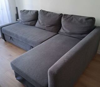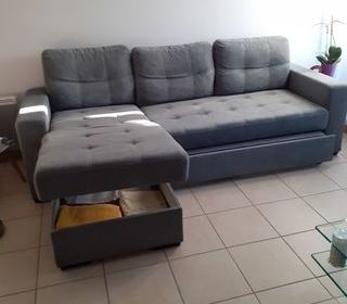Canapé Ikéa gris FRIHETEN (acheté 500) Canapé + méridienne + lit pour 2 + coffre rangement Lit spacieux et très confortable pour la nuit. La méridienne se place du côté que l'on
