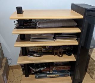 cotes hors tout - hauteur : 112cm - largeur : 88cm - profondeur : 43cm 5 plateaux permettant de disposer des éléments de chaine hifi (ou autre) la hauteur entre plateaux est perm