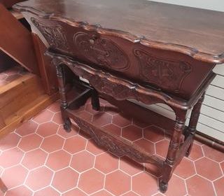 meuble ancien en bois sculpté avec motifs floraux. Dispose d'une structure robuste, une surface spacieuse pour le travail et un tiroir pour le rangement. Couleur marron foncé avec