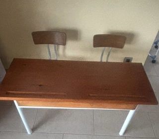 bureau pour 2 élèves. en bois, avec casier de rangement . piètement en fer de couleur gris. trés bon état