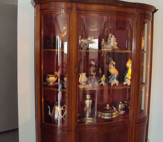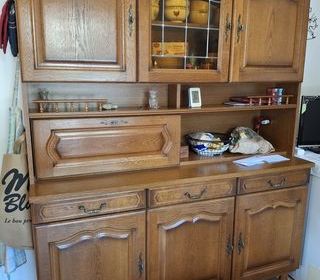 Buffet en bois avec combinaison de placards et tiroirs. Dispose de deux parties : une partie basse avec trois portes et trois tiroirs, ainsi qu'une partie haute comportant une vitr
