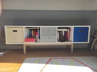Meuble télé blanc L1.77m l 35cm hauteur 64cm 4 niches 2tiroirs gris 2boites de rangement jaune et bleu à retirer sur place