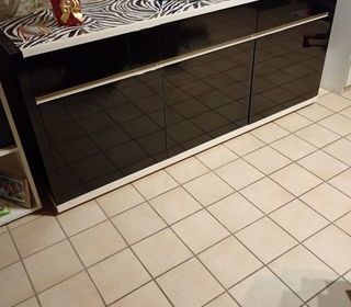 Je vends ce buffet bas noir laqué avec plateau motif zèbre. Parfait pour apporter du style et du rangement à votre salon ! - Type de produit : Buffet bas - Matériau : Laqué noir