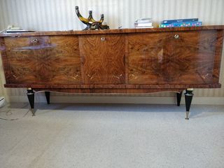 Vente SAM complète Meubles Année 1970 en bois vernis foncé, composée d'une table avec rallonge pouvant accueillir 6 personnes avec 6 chaises, d'un meuble bas 5 portes et d'un meu