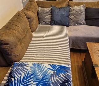 A vendre canapé 6 places acheté 1300 euros il y atrois ans. Un accroc sur une méridienne peut être couvert par un plaid. Deux coffres pour ranger les couvertures ou draps. Il peut