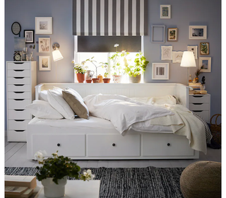 Lit banquette 2 places Ikea - vendu complet (avec matelas etc) pour cause de déménagement. Lit 1 place qui peut se transformer en deux places quand on le déplie. Rangements intérie