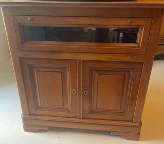 Élégant meuble TV en merisier massif, alliant praticité et qualité artisanale. ? **Plateau tournant** pour orienter facilement l'écran ? **Compartiment coulissant** pour un