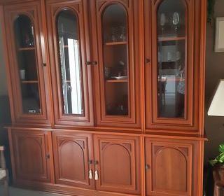 Meuble de rangement en deux parties bas 4 portes haut 4 portes vitrées hauteur 2,10 m/largeur 2,00 m/profondeur 0,50 m placage merisier A retirer sur place