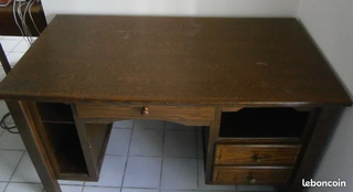 Très joli bureau pour enfants ou adultes. Nombreux rangements. Très pratique. Longueur : 127 cm Largeur : 64 cm Hauteur : 77 cm 3 tiroirs + niches Quelques défauts du verni