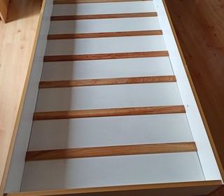 Tiroir lit pour couchage ( lattes) ou rangement. Très solide, se glisse sous un lit standard d'une personne ( roulettes). Dimensions : Longueur : 1,88m Largeur : 0,92 m Hauteur
