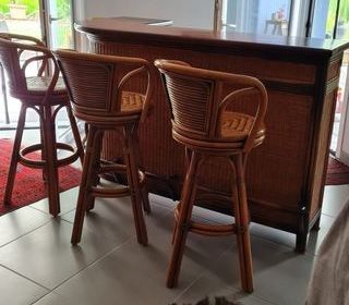 Vds bar tressage rotin + bois exotique et 4 tabourets tournant BAR 179X45 / 84X110 TABOURETS 53X53X H 109