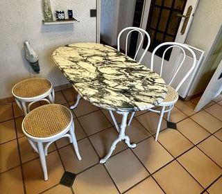 1 table marbre blanc / gris rectangle avec bouts demie-lune - piètement métal peint blanc Dimensions table : 120 x 65 x 74 cm (L x P x H) 2 chaises blanches empanner rotin arm